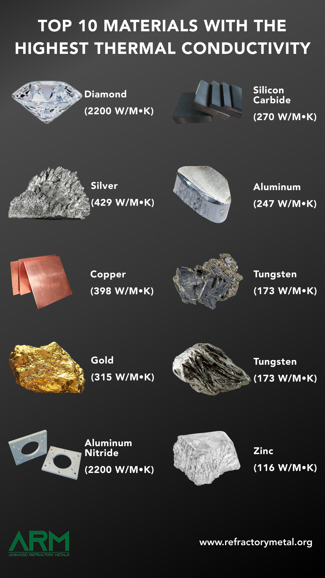 There are lots of highly thermally conductive materials, and most of them are metals. We have discussed their specific features and usages. Hope that you can have a better understanding of these materials and the concept of thermal conductivity. Advanced Refractory Metals provides quality metals and alloys of different sizes and shapes within a short lead time. You can check our website for your inquiry.